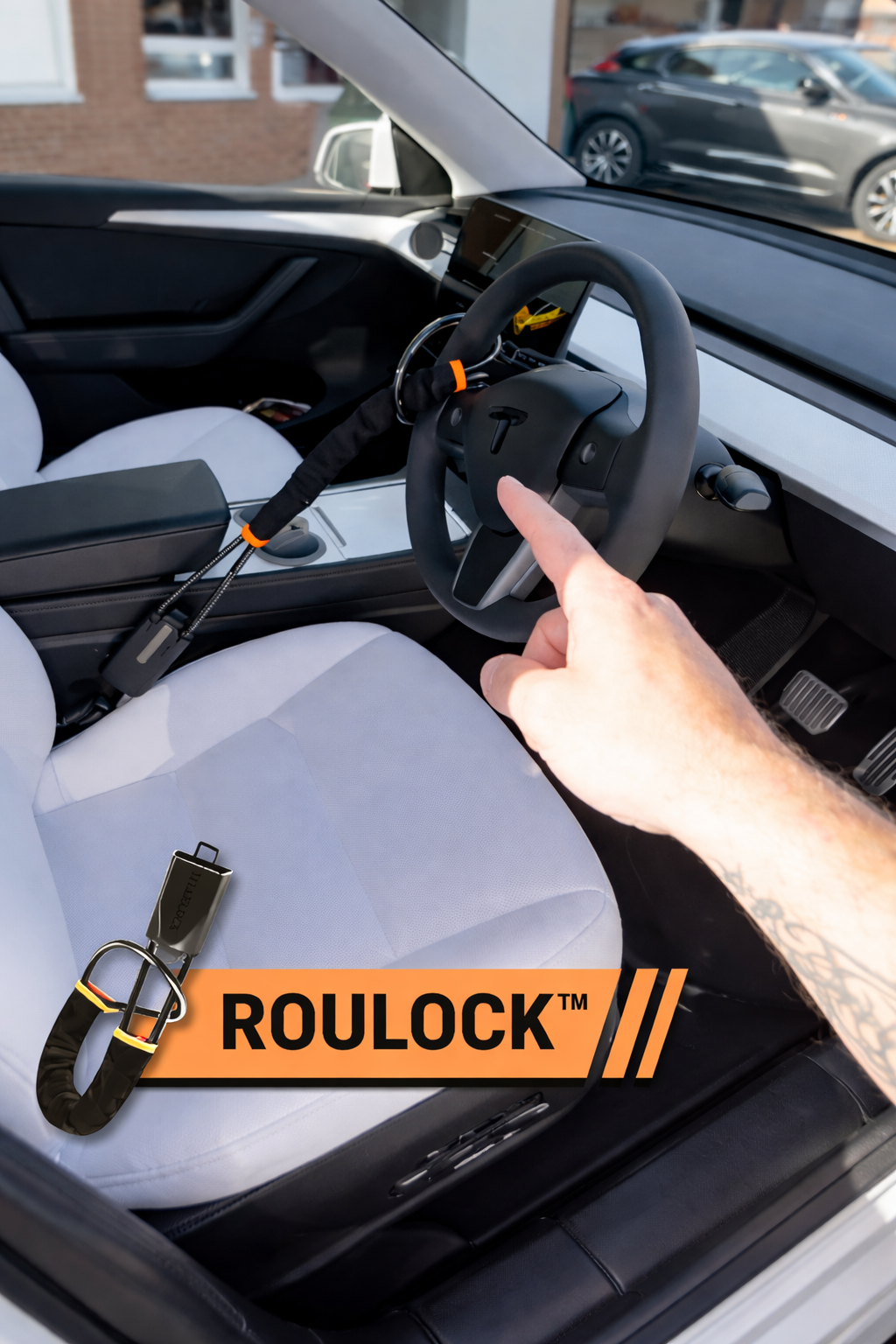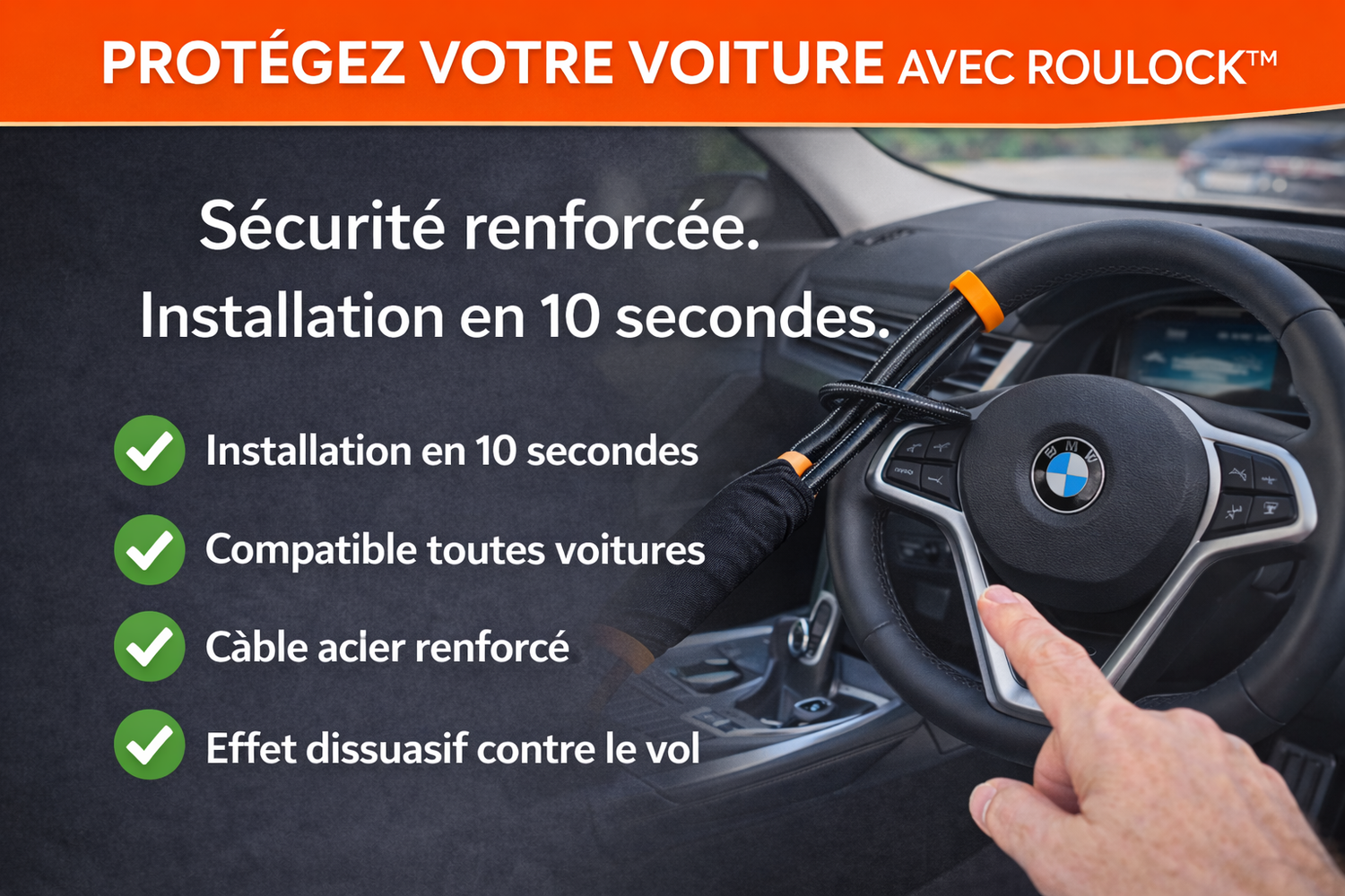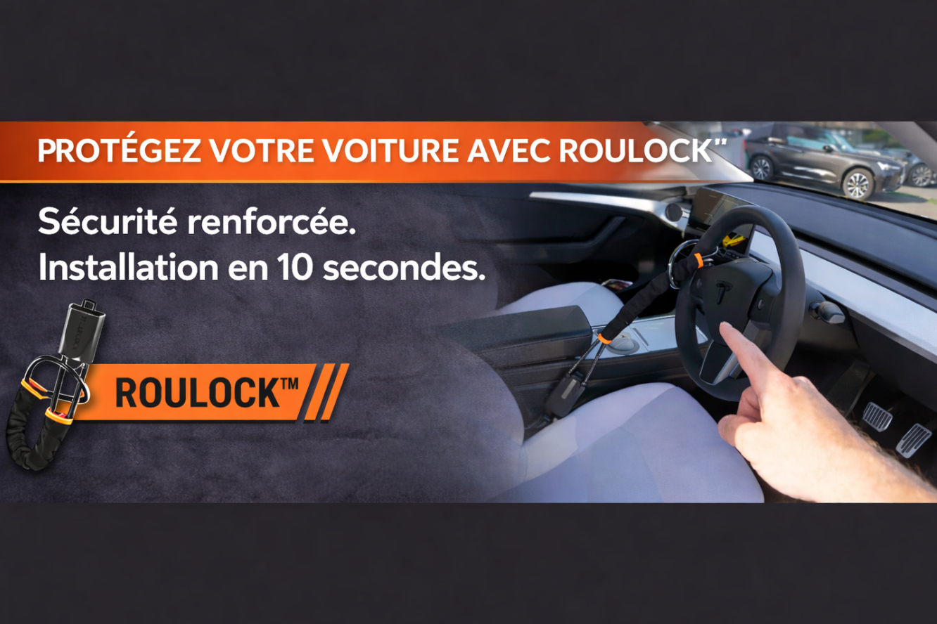 Protégez efficacement votre voiture avec ROULOCK™.Installation rapide en seulement 10 secondes, sans outil.Une solution robuste et dissuasive contre le vol.